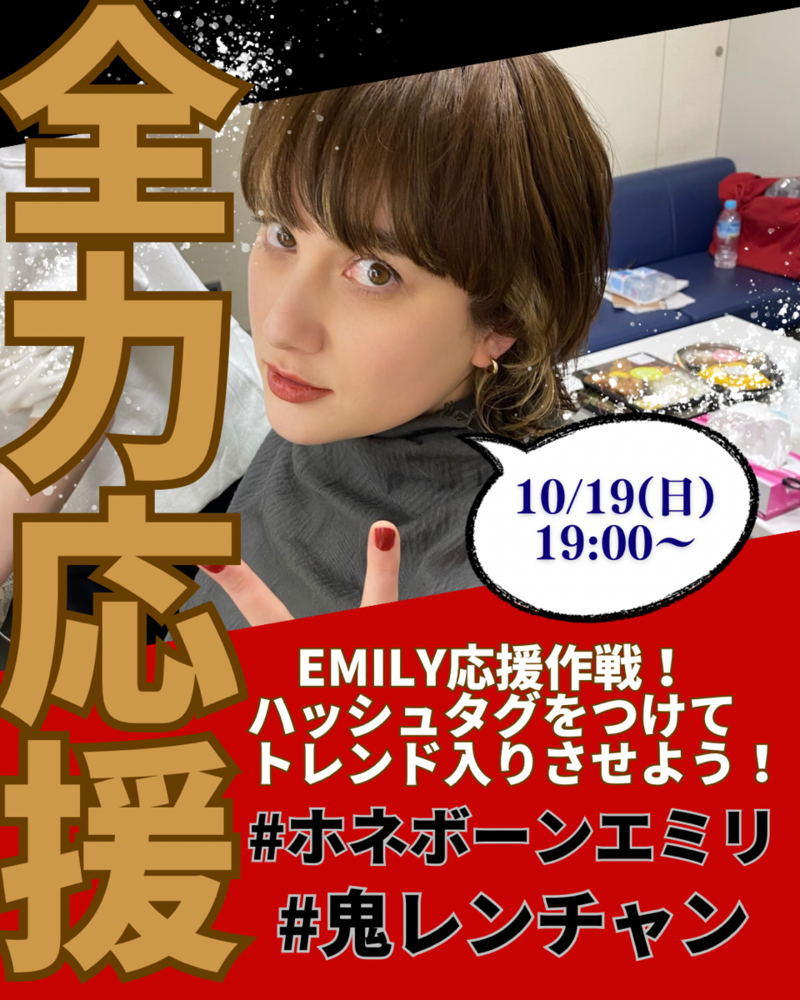 10/19(日)19:00オンエアのフジテレビ系「千鳥の鬼レンチャン」に出演する EMILY を、みんなでトレンド入りさせて盛り上げよう🔥