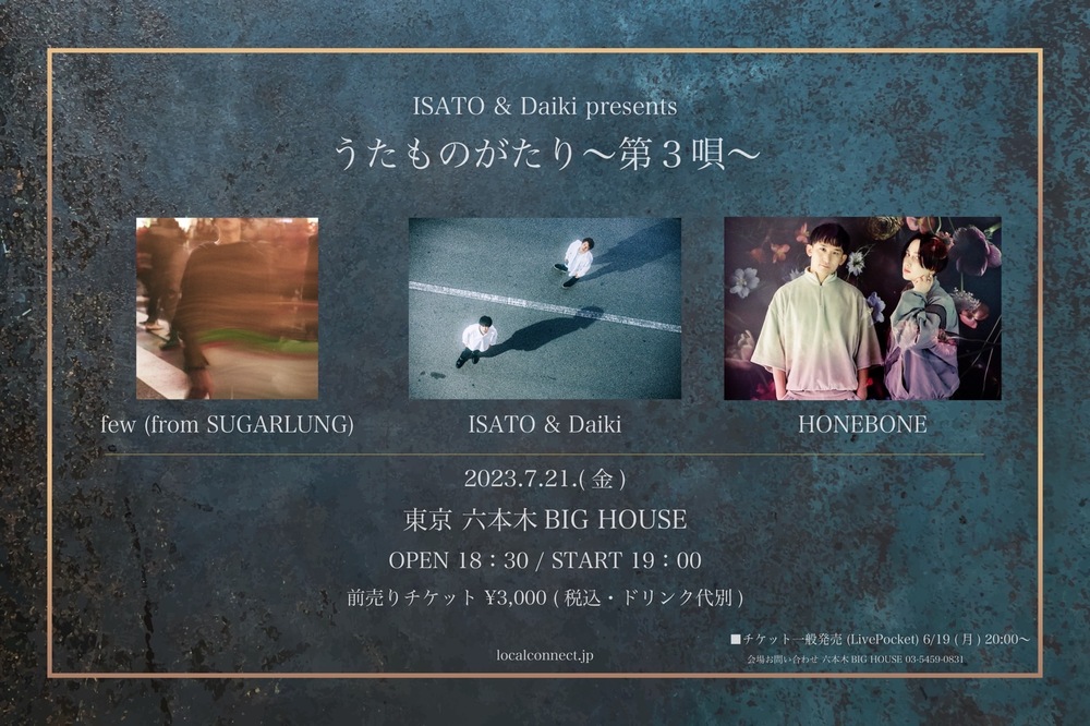 2023.7.21(金)六本木BIG HOUSE SCHEDULE 2023/07/21(金) 19:36 - 六本木BIG HOUSE 地図を表示 開場18:30/開演19:00 ・ISATO & Daiki ( LOCAL CONNECT ) /HONEBONE /few チケット¥3,000(ドリンク代別途) LOCAL CONNECT presents ISATO&Daiki うたものがたり~第3唄 ~ チケットは6/19(月)20:00〜発売 URLをコピーする 報告する